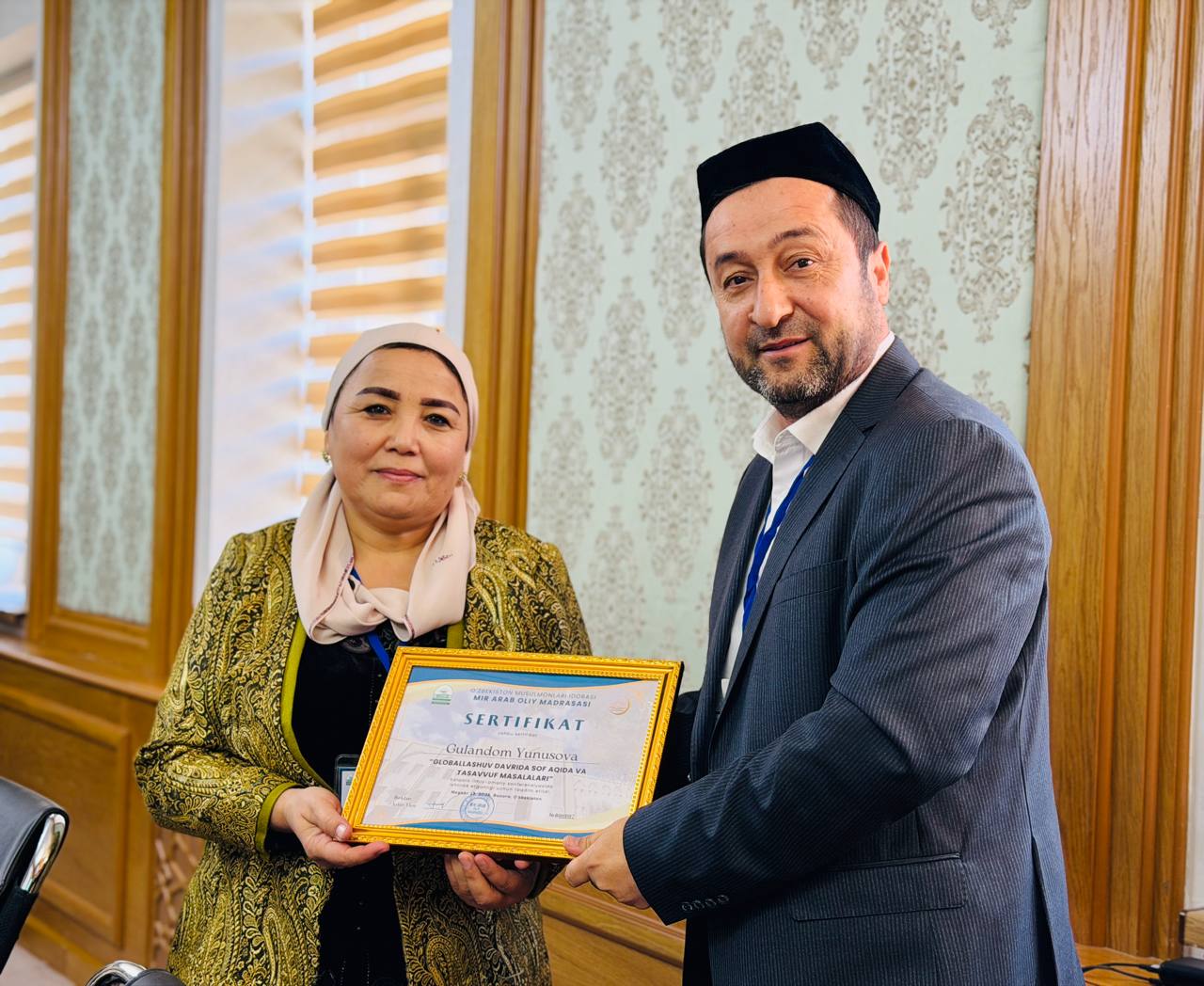 Анжуман сўнгида барча маърузачиларга эсдалик совғалари ҳамда сертифатлар топширилди ҳамда Олий мадраса ректори устоз Жобир домла Элов томонидан барча ташриф буюрганларга ва ташкилотчиларга миннатдорлик билдирилди.